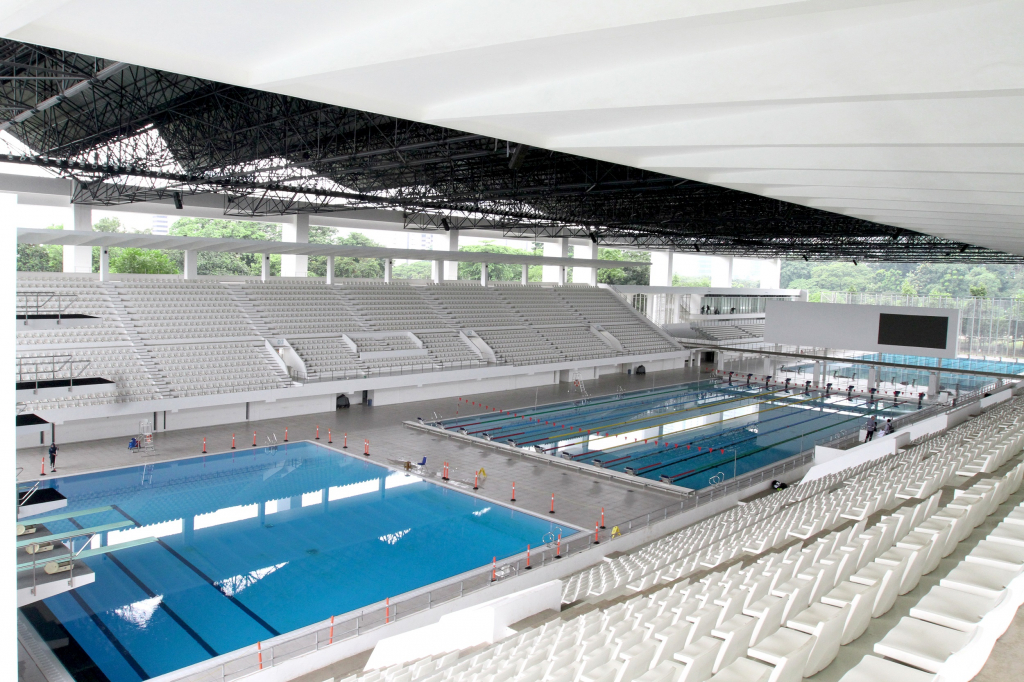 Stadion Renang Akuatik yang terdiri dari Kolam Diving,Kolam Pemanasan,Kolam tanding, dan Kola ...